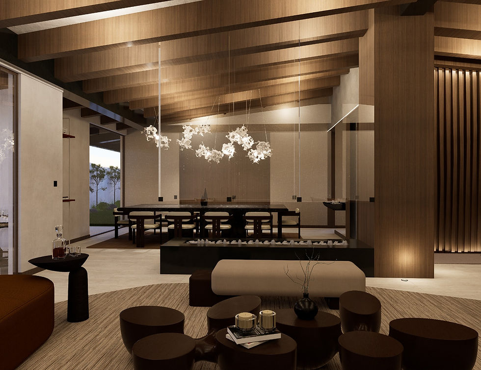 En la Residencia Cañada, las áreas sociales se integran en un esquema open space que conecta sala, comedor y cocina de forma fluida y natural. La distribución favorece la amplitud, la convivencia y la continuidad visual, mientras que la mezcla de texturas y materiales cálidos aporta identidad y equilibrio, creando un ambiente acogedor para compartir.